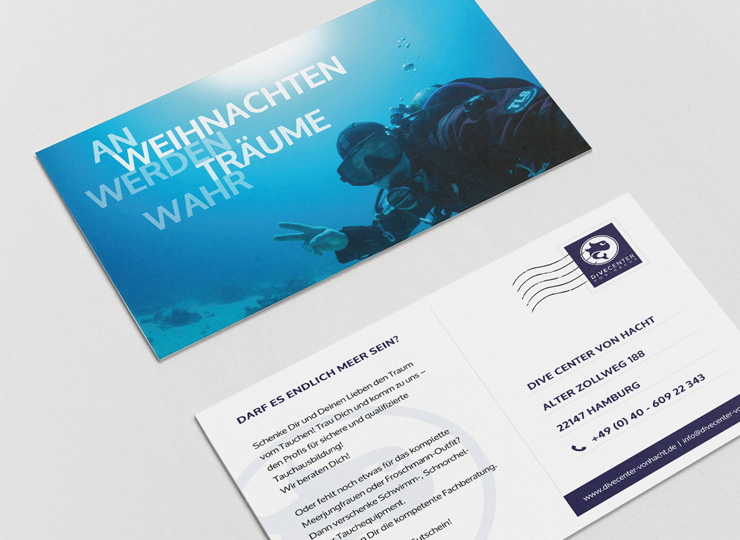 Das Dive Center von Hacht bietet Tauchaus- und Weiterbildung sowie meeresbiologische Seminare an. Im Hamburger Tauchshop gibt es eine professionelle Beratung und Tauchequipment führender Hersteller. Neben einem Logo wurden diverse Drucksachen und Werbemittel gestaltet.