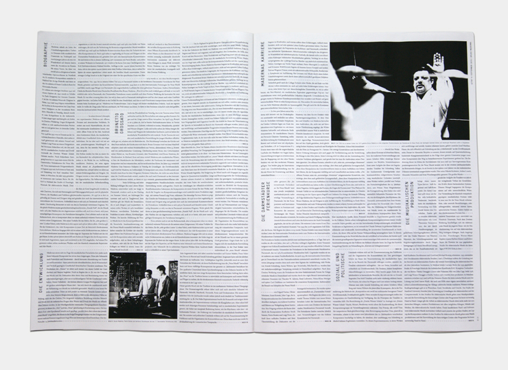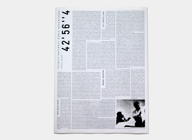 Maderna war ein Vertreter der musikalischen Avantgarde. In seiner Musica su due dimensioni von 1958 werden erstmals traditionelle akustische Instrumente zusammen mit elektronischen Klängen in einem Werk verwendet. Gestaltet wurde eine Zeitung, in der durch Bilder und Texte sein Leben und Schaffen dokumentiert wird.